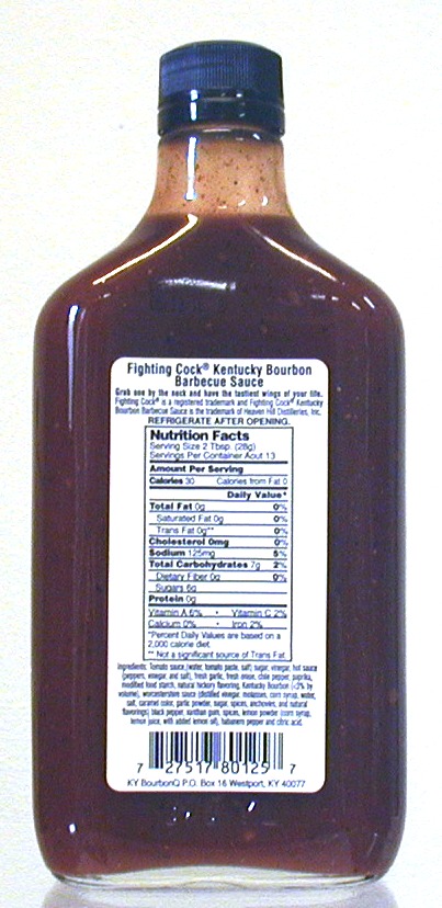 Ingredients: Tomato Sauce, Sugar, Vinegar, Hot Sauce, Fresh Onions, Fresh Garlic, Chile Pepper, Paprika, Corn Starch, Natural Hickory Smoke Flavoring, Oil of Capsicum, Fighting Cock Kentucky Bourbon.
