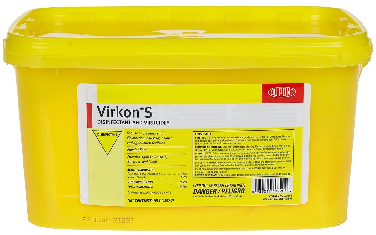 Virkon-S powder 10 lb (+ freight) is a broad spectrum disinfectant that is effective when in solution at low temperatures, hard water, on porous surfaces and in the presence of organice matter. Starts killing bacteria in 5 min. Use 1.3 to 2.6 ounces powder per gallon of spray. 10 lbs will make 60 to 120 gallons of spray.