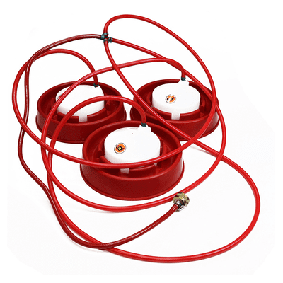 auto drinker bowl 9" diameter. Has 1/4" diameter "T" (2 nipples) for hose attachment, so you can set up a series of several of these waterers on the same water supply line. For low pressure watering system - such as using a bucket or barrel a few feet higher than waterers to supply water or a pressure reducing valve inline to your high pressure water supply.