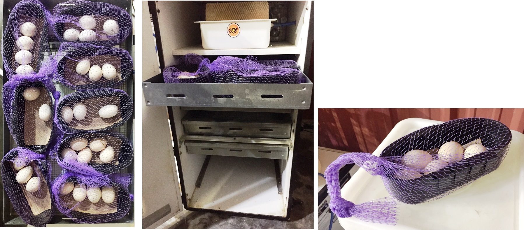 The best way I have found to use these in the GQF Sportsman incubator or hatchers (or similar models), is to use plastic tubs or water cups, place some textured paper in the bottom like paper towels or brooder liner paper (something not slick) and put the eggs in the container and the bag over the container and tie a loose knot in the open end of the bag. This gives more room for the chicks to move after hatching and is very easy to clean up after the hatch, and usually the bags are still clean and reusable.