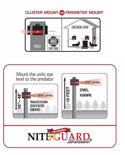A: For owls, we recommend that you purchase 4 lights and place them on a single post located near the center of the area to be protected. In a large area (several acres), you may need two or more clusters of four lights. Put the lights 10-14 feet high on the post with each light facing a different direction. This will ensure your entire area will be covered. The lights can be seen up to a 1/2 mile in the direction they are facing. If you are not located on flat ground, you will need to adjust the height of the lights on the post. If located on a hill, adjust the lights lower, as the owls may be coming from below the area to be protected. If located in a valley adjust the lights higher as the owls may be coming from above. For use with Purple Martin houses, mount the lights directly to the house itself or one foot above the house on the same post, or put the lights on a separate post and place the post nearby the house. For use with guineas or gamefowl which run loose, you may need to place the lights higher than 14 feet; put the lights at the same level as the birds are roosting.Q: What’s the best way to place the lights for use against small ground predators?