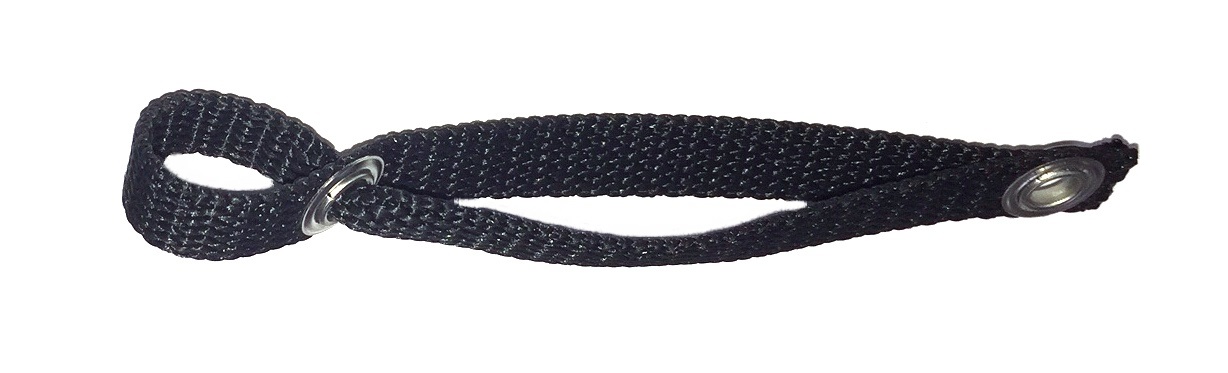 A nylon hitch especially for baby stags and use below the spur. 1/2" wide, made with stainless steel grommets, will fit our nylon or weed eater cord, but will NOT fit rubber cord. If you want a stretch cord for these, you will have to do something of the sort of using PVC swivels 2-3 feet from the leg with rubber on the ground end and nylon or weed eater cord on the bird end.