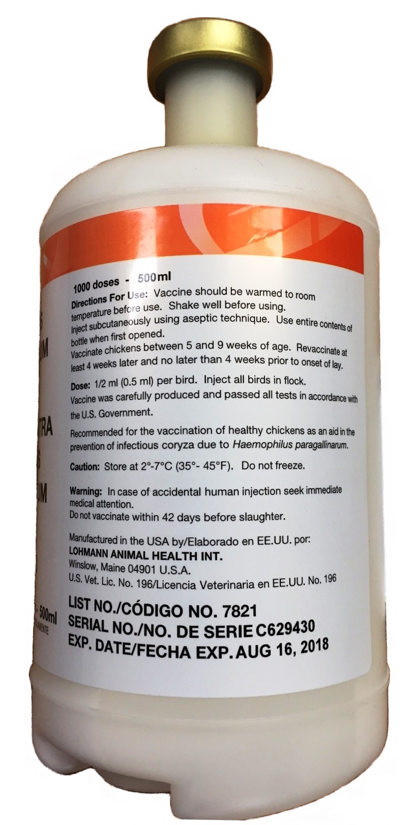 Active Ingredient(s): The infectious coryza bacterin is prepared from concentrated cultures of three antigenic strains of Haemophilus paragallinarum.